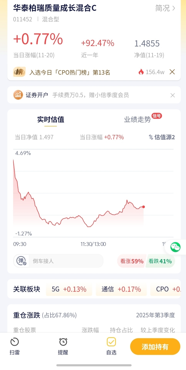 华泰柏瑞质量成长混合C今日预估涨幅0.77%!在自选里涨幅领先,质量成长方向表现稳健,值得关注