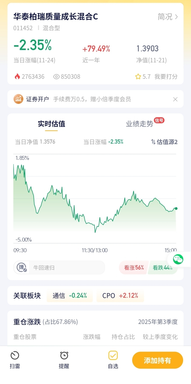 10. 【华泰柏瑞质量成长混合C估值播报+11.24行情】