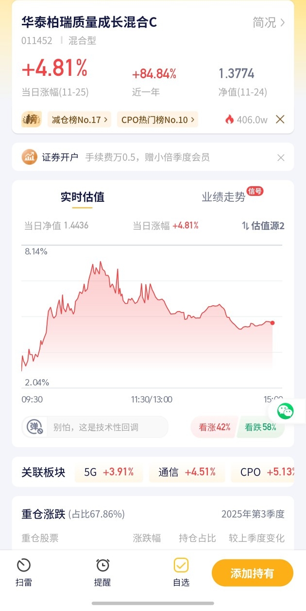 华泰柏瑞质量成长混合C今日预估涨幅+4.81%!在自选里表现靠前,