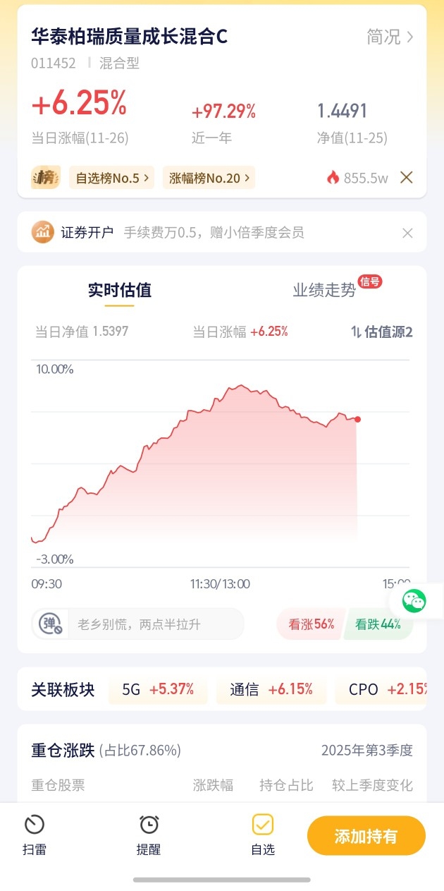 华泰柏瑞质量成长混合C今日预估涨幅6.25%!在自选里涨幅领跑,表现相当给力