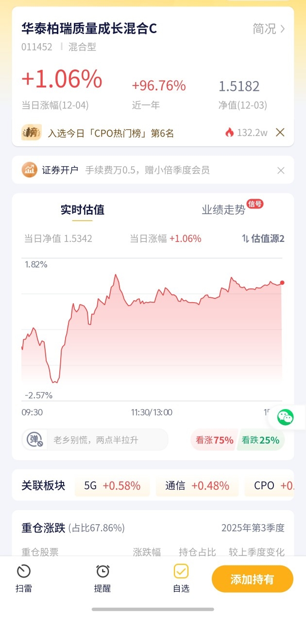 华泰柏瑞质量成长混合C今日预估涨幅1.05%!不仅最新涨了0.7%,今日估值也跟涨,自选里的“双红选手”