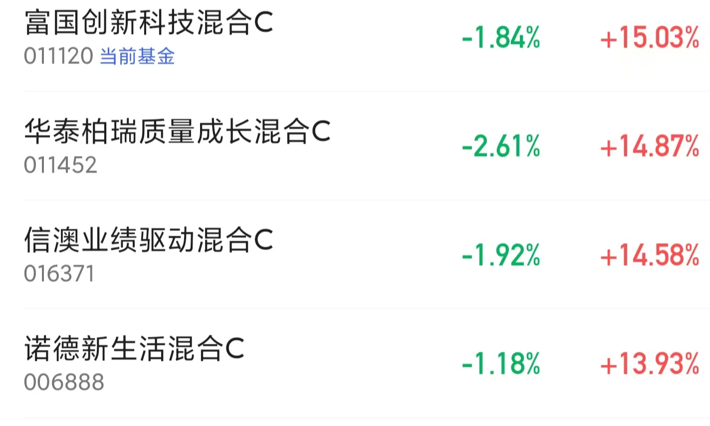 今天再次回调,$富国创新科技混合C$一个月收益15个点,$华泰柏瑞质量成长C$稍