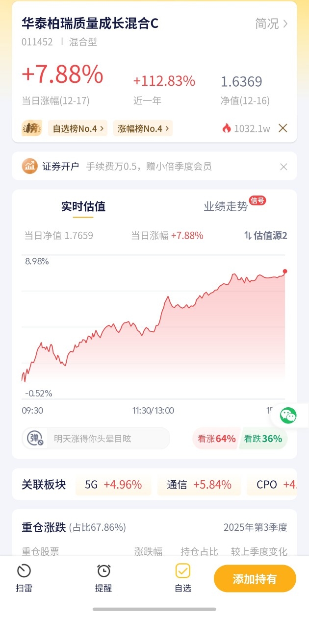 华泰柏瑞质量成长混合C今日预估涨幅7.88%!在自选基金中涨幅遥遥领先,表现十分突出