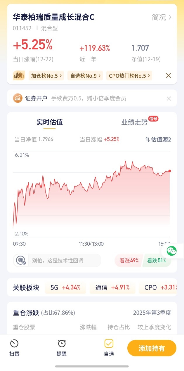 华泰柏瑞质量成长混合C今日预估涨幅5.26%!在自选基金中涨幅居首,表现十分突出