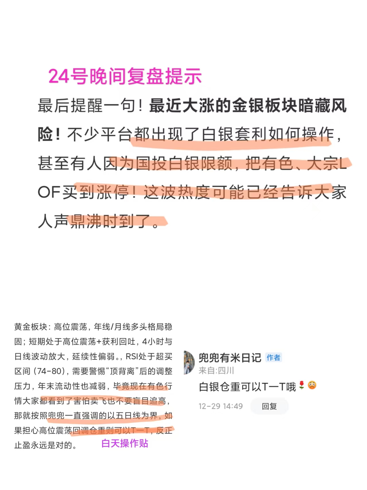 白银黄金的节奏更是绝!兜兜每次提示都精准踩点:25号预警套利有风险,26号场内白银LOF直接跌停;26号下午提示黄金仓位重的赶紧T,29号再发预警,当晚就暴跌!这提示够不够及时?