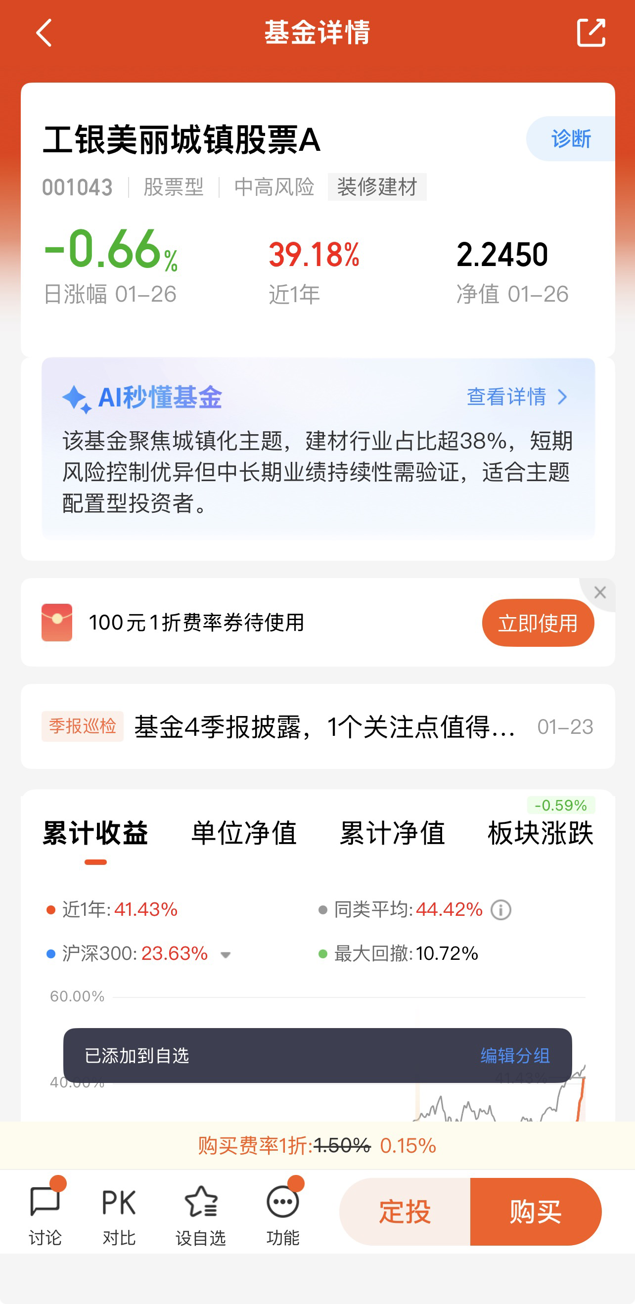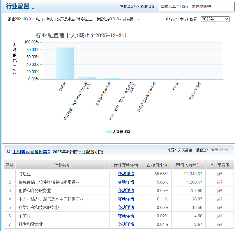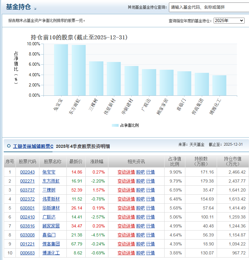 截至2025年末,基金股票仓位高达93.98%,高度聚焦制造业(85.68%),前十大重仓股集中于建筑建材、家居消费等领域,如兔宝宝(9.90%)、东方雨虹(9.79%)、三棵树(6.59%)等细分龙头。