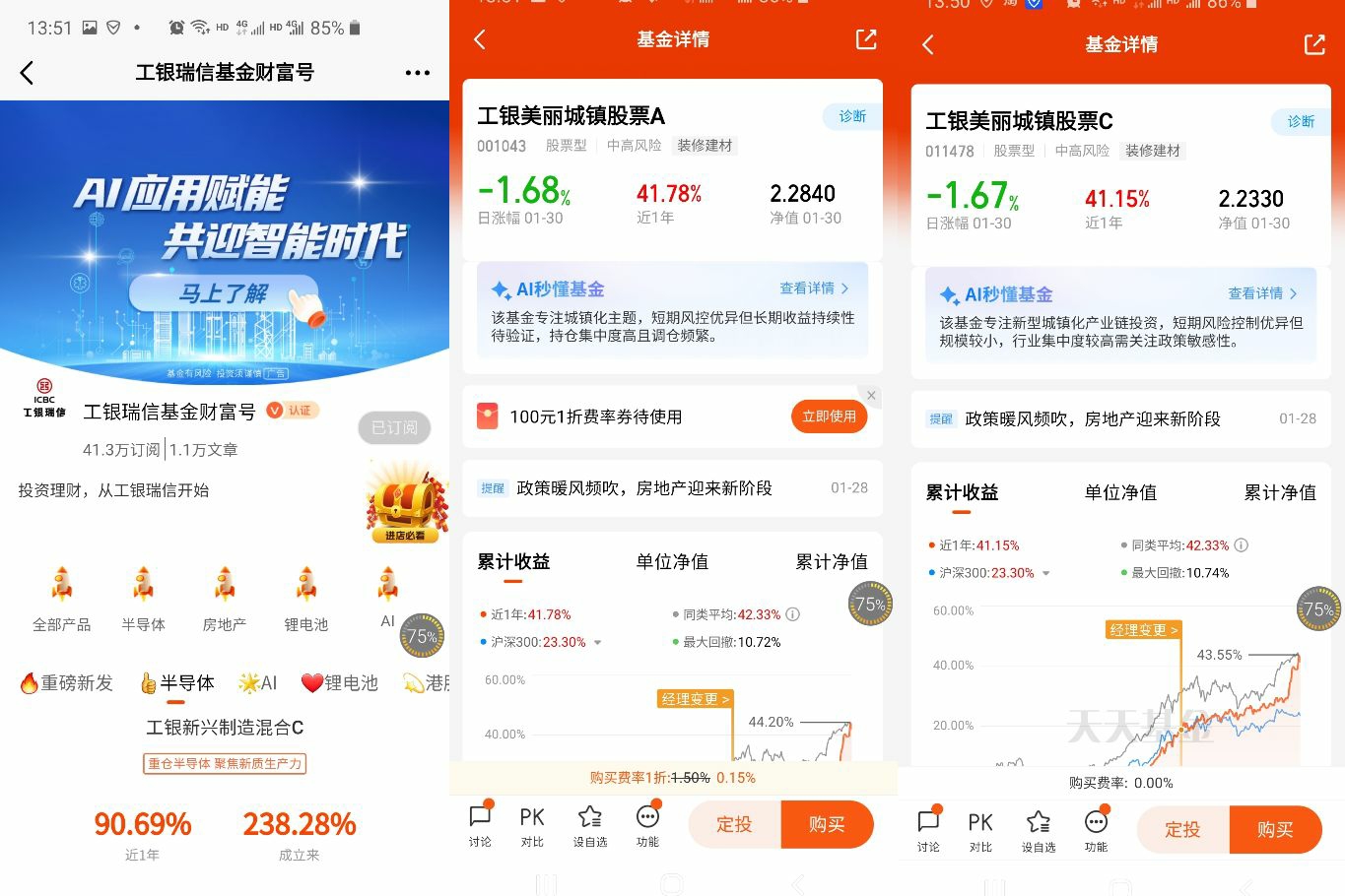 提前布局,低估买入是投资的必赚法门。一键布局房地产,推荐关注:$工银美丽城镇股票C(OTCFUND|011478)$。本基金聚焦新型城镇化相关产业链,重点配置建材、轻工等政策受益行业,近1年收益率达到41.15%,今年短短一个月,收益率也有11.37%,值得关注!@工银瑞信基金