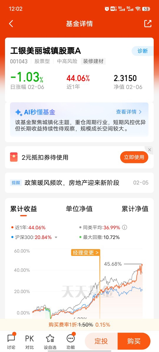 房地产经过多年的调整,目前已趋于稳定,我认为房价目前向下探的空间有限,目前是处于底部。而且房地产行业经过累年下行,已逐步完成深度调整。$工银美丽城镇股票A$ 近一年44.06%。今年以来上涨12.87%。2015年成立至今已上涨180.31%。该基金成立至今10年时间,接近2倍收益,可见房地产相关产业链也是有所发展的。@工银瑞信基金