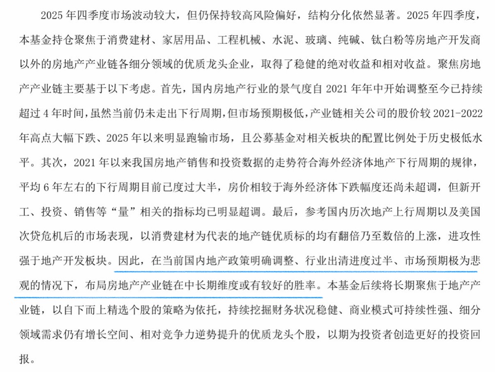 该基金的基金经理在报告中明确指出,其四季度的持仓聚焦于消费建材、家居用品、工程机械、水泥、玻璃等房地产开发商以外的产业链细分领域龙头。做出这一决策基于三重考量:第一,行业调整已持续超过4年,市场预期极低,产业链公司股价较前期高点大幅回落,且机构配置比例处于历史低位,提供了较高的安全边际;第二,参照国际经验,地产下行周期平均约6年,目前时间已过大半,且销售、投资等“量”的指标调整幅度已深;第三,历史经验表明,在行业复苏周期中,以消费建材为代表的产业链优质公司,其股价弹性往往强于开发商本身。因此,在行业出清过半、政策方向明确的当下,布局产业链被视为一种中长期胜率较高的选择。