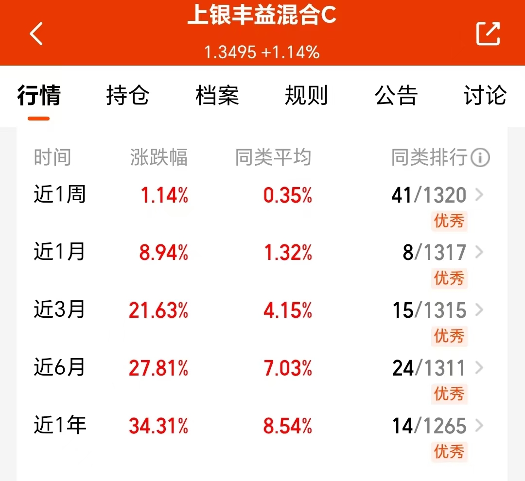 所以今天打算补仓$上银丰益混合C(OTCFUND|011505)$,这只基我还挺满意的,回撤小,涨得也快,昨天收了114个蛋,现在持有收益率都5.71%了!它是偏债混合基,主要靠固收打底,再加点权益类资产,特别符合我想稳中有进的需求。