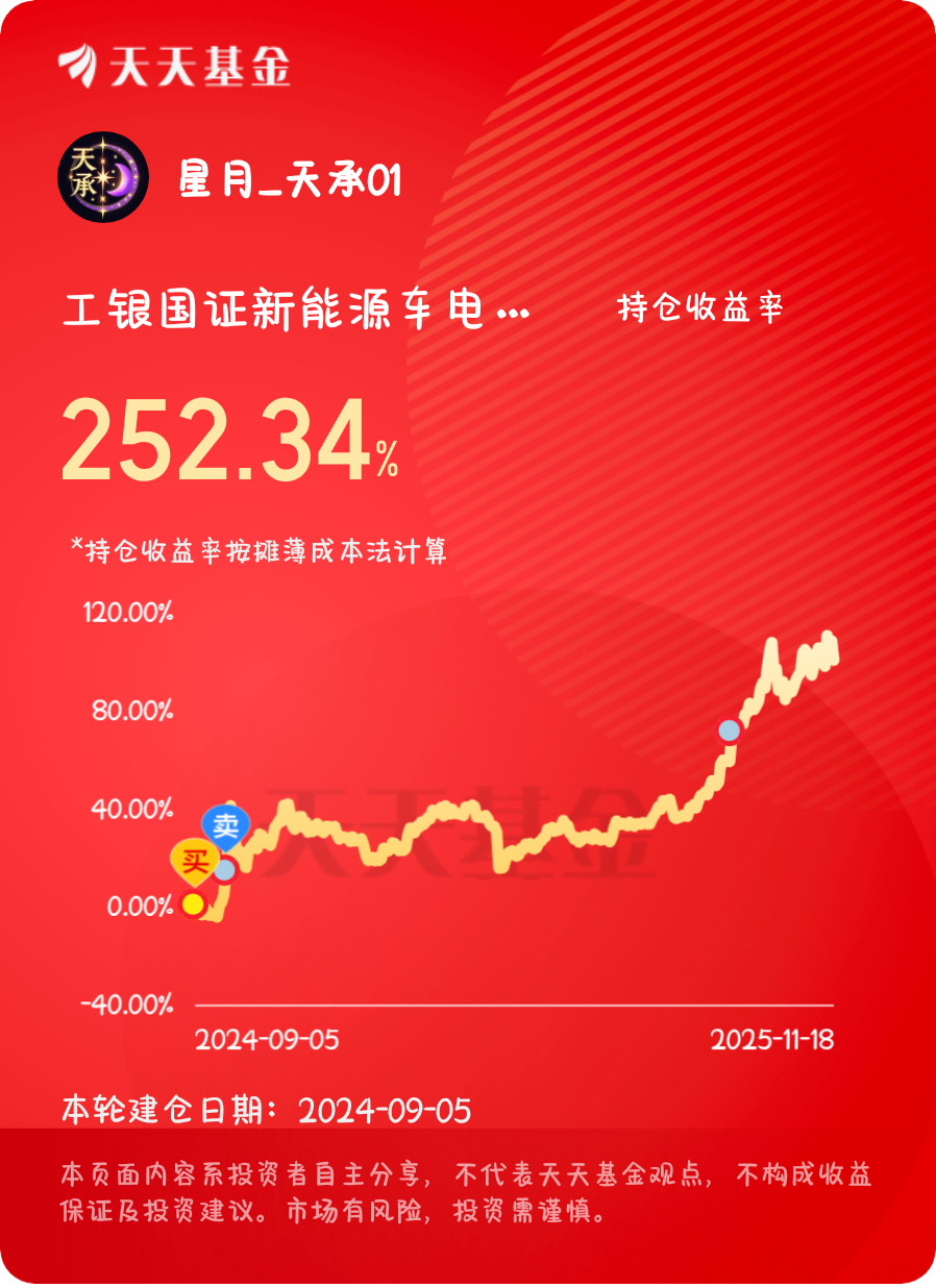 2025年11月19日,新能源车中长线目标超额完成,风险与收益并存,心满意足,止盈至极小仓位,踏空无悔。只做笔记,不做推荐。操盘有风险,勿跟。我干了,你们随意。