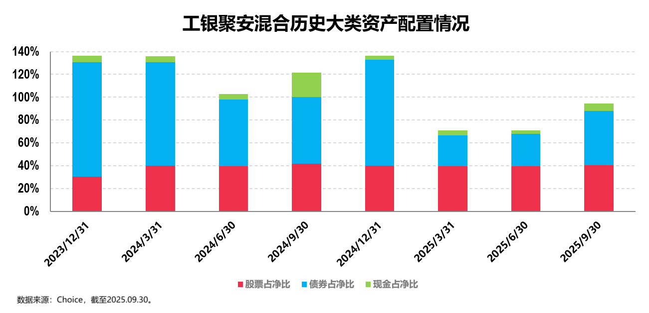 从历史持仓数据来看,自2024年二季度至2025年三季度,工银聚益混合的平均股票(含港股)仓位为22.86%,平均债券仓位为56.42%,股债仓位均会做一定调整。最新的2025年三季报显示,其股票(含港股)仓位为11.16%,债券仓位为44.17%。(数据来源:基金各定期报告,股票、债券仓位为占基金资产净值的比例。)