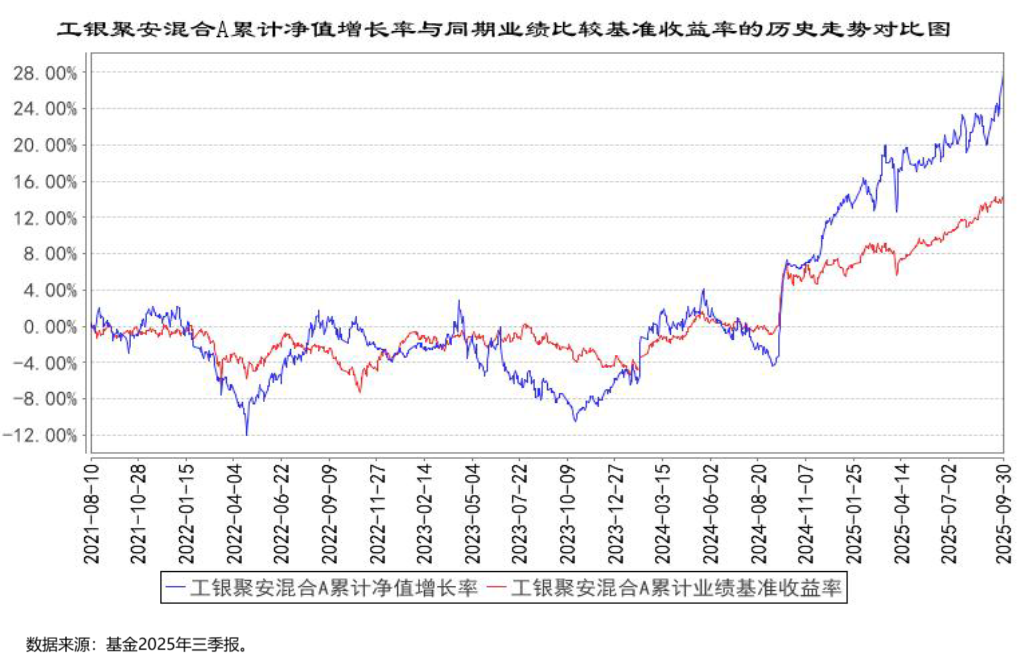 从收益的角度来看,截至2025年9月30日,工银聚益混合A过去一年的累计总回报为8.47%,相较于同期业绩比较基准7.60%有一定超额。