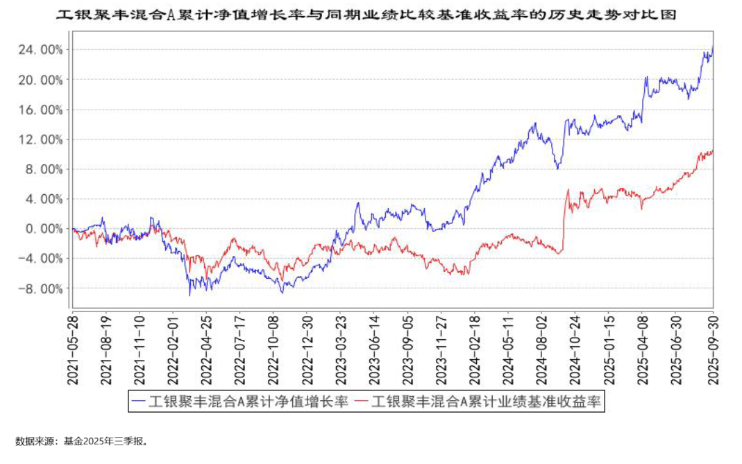 从收益的角度来看,截至2025年9月30日,工银聚丰混合A过去一年和过去三年的累计总回报分别为9.08%和33.72%,同期业绩比较基准分别为6.95%和16.64%,超额收益较为显著。