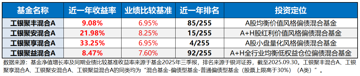 值得一提的是,这只产品相较于同类产品的业绩排名非常靠前。根据银河证券的数据,截至2025年9月30日,工银聚丰混合A过去一年和过去三年的业绩排名分别为85/255、10/250。(注:排名数据来自银河证券,数据均截至2025年9月30日,同类为“混合基金-偏债型基金-普通偏债型基金(股票上限高于30%)(A类)”。)