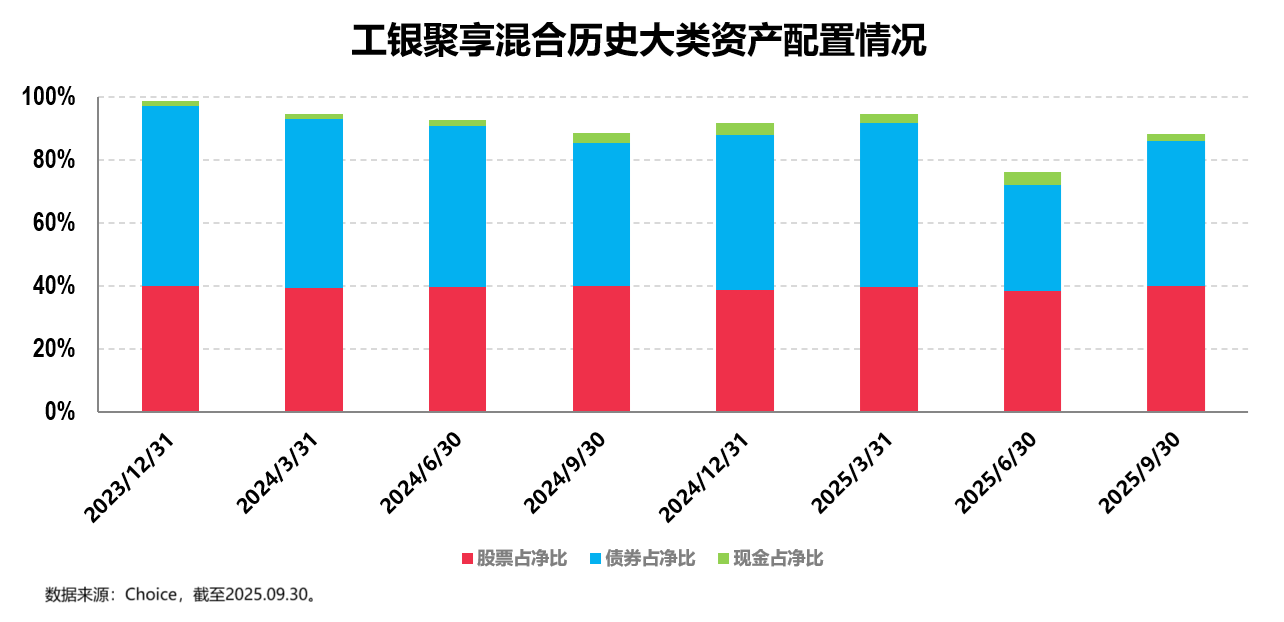 从历史持仓数据来看,自2023年四季度至2025年三季度,工银聚享混合的平均股票仓位为39.31%,平均债券仓位为48.58%,历史股债仓位(特别是股票仓位)比例相对稳定,是一只典型的偏债混合产品。最新的2025年三季报显示,其股票仓位为39.82%,债券仓位为46.15%。(数据来源:基金各定期报告,股票、债券仓位为占基金资产净值的比例。)