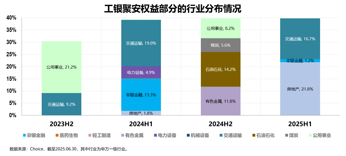 工银聚安混合权益部分在投资风格与工银聚丰混合较为类似,其聚焦的交通运输、房地产、资源类(有色、煤炭、石油石化)、公用事业等行业大多具有低估值、高股息的特征。