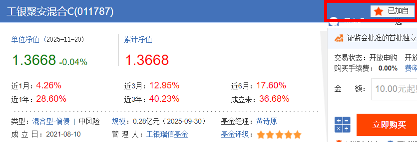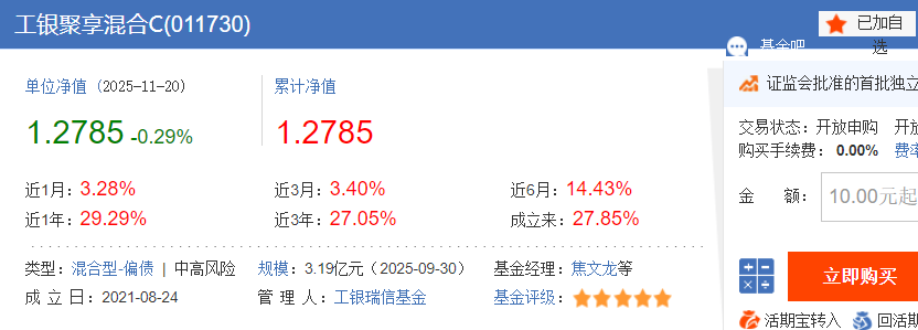 工银聚安混合(A 类:011786;C 类:011787)成立于 2021 年 8 月 10 日,同样属于偏债混合型基金,核心策略为 “低估价值 + 固收 + 港股”,股票仓位最高可达 40%,并可通过港股通投资港股市场,为组合增添多元收益来源。