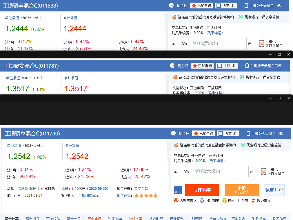 - 工银聚安混合:适配偏好低估值板块、希望布局港股分散风险,追求稳健收益的投资者,低估持仓为组合提供较强抗跌性;