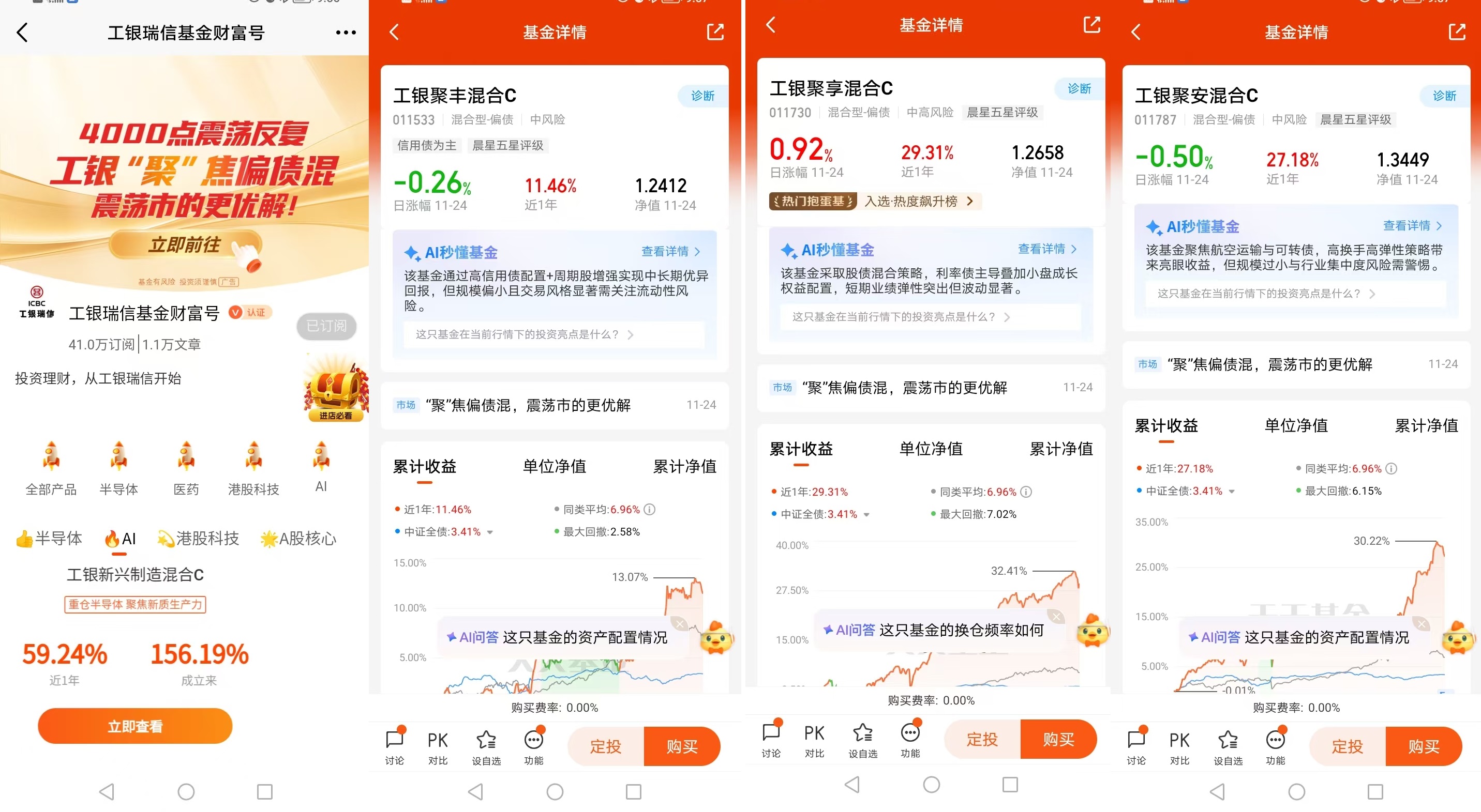 就在我愁得快放弃的时候,做财务的儿子给我推了工银聚丰混合C(011533)。他说:“妈,现在这市场,纯存款跑不赢通胀,纯股票风险太高,偏债混合基金才是咱们的菜。这只基金主要投债券,稳得住;少部分投优质股票,能多赚点,就像您做饭,主食管饱,配菜提味,营养又安全。”