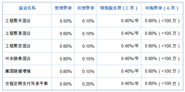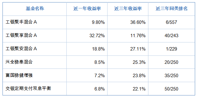 主要对比产品包括:工银聚享混合(011729)、工银聚安混合(011786)、兴全稳泰混合(003967)、富国稳健增强(000107)、交银定期支付双息平衡(519732)等。这些产品均为市场上知名的偏债混合型基金,具有较强的代表性。