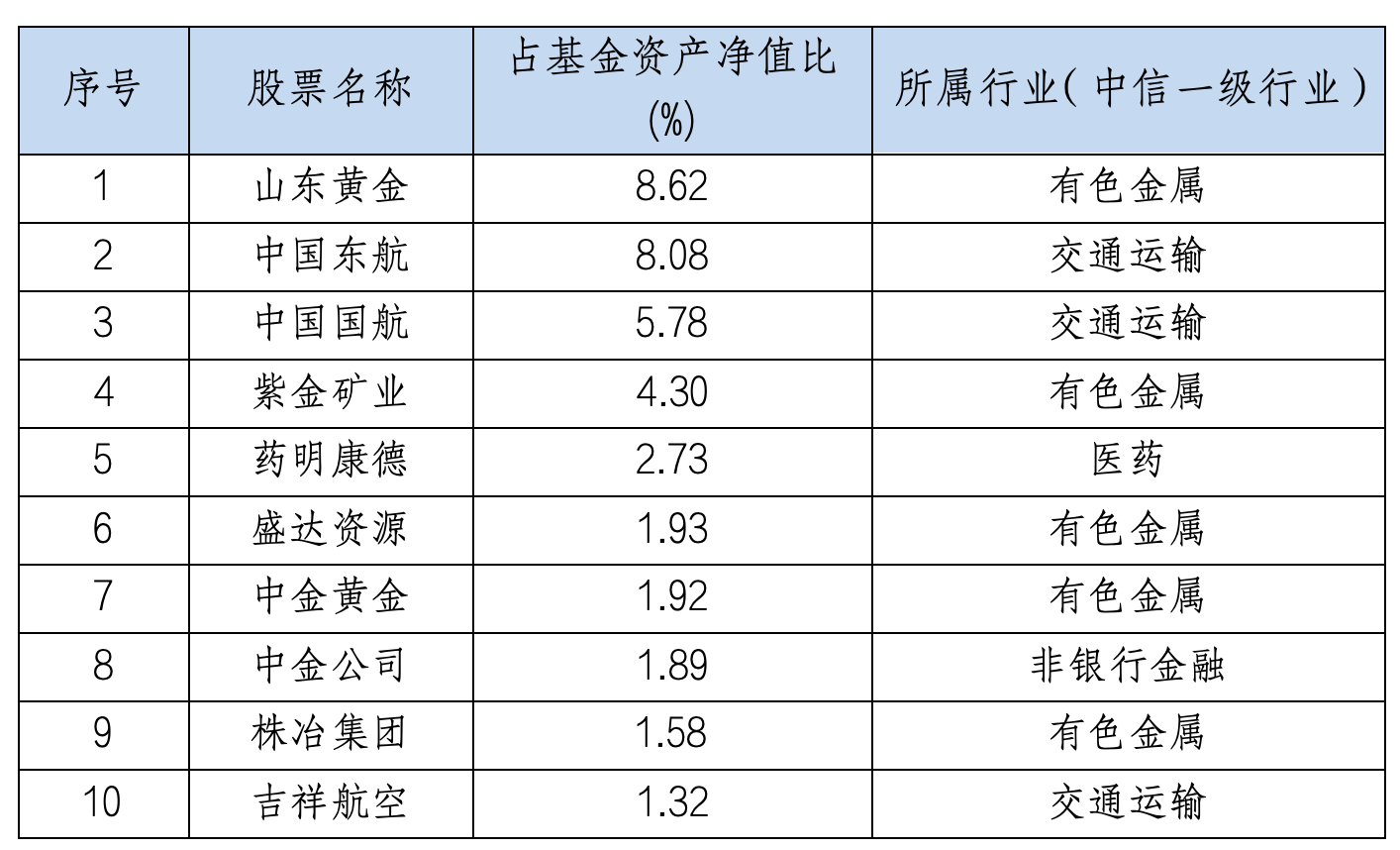 在持仓特征上,该基金呈现出"集中持仓、分散行业"的特点。一方面,前十大重仓股集中度较高,长期超过60%,体现了基金经理对优质个股的信心;另一方面,这些重仓股分布在多个低相关性行业,有效分散了行业风险。从具体持仓看,前三大重仓股山东黄金、中国东航、中国国航合计占净值比例超过20%,但它们分别属于不同的行业,相关性较低。