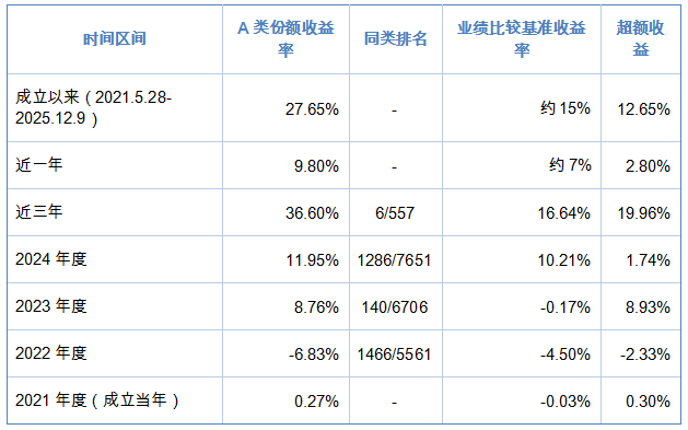 从上表可以看出,该基金在大多数年份都实现了超越业绩比较基准的表现。特别是在2023年,当业绩比较基准为-0.17%时,该基金取得了8.76%的正收益,展现出优秀的抗跌能力。近三年36.60%的收益率,在同类557只基金中排名第6,充分体现了基金经理的投资管理能力。