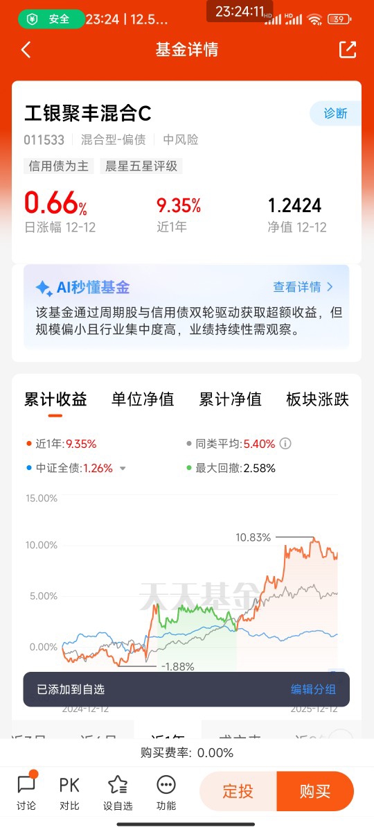 工银聚丰混合C(代码:011001)作为"聚"系列中的均衡价值代表,在权益端通过行业分散和风格均衡,有效降低了单一行业或风格暴露风险,同时固收底仓提供了稳定的票息收益。在当前市场波动加剧的背景下,这种"固收打底+权益增强"的配置思路,既能在市场上涨时分享收益,又能在市场下跌时控制回撤,是稳健型投资者进行资产配置的理想工具。工银瑞信凭借扎实的投研实力,通过均衡价值策略为投资者提供了穿越周期的投资选择,值得长期关注。$工银聚丰混合C$