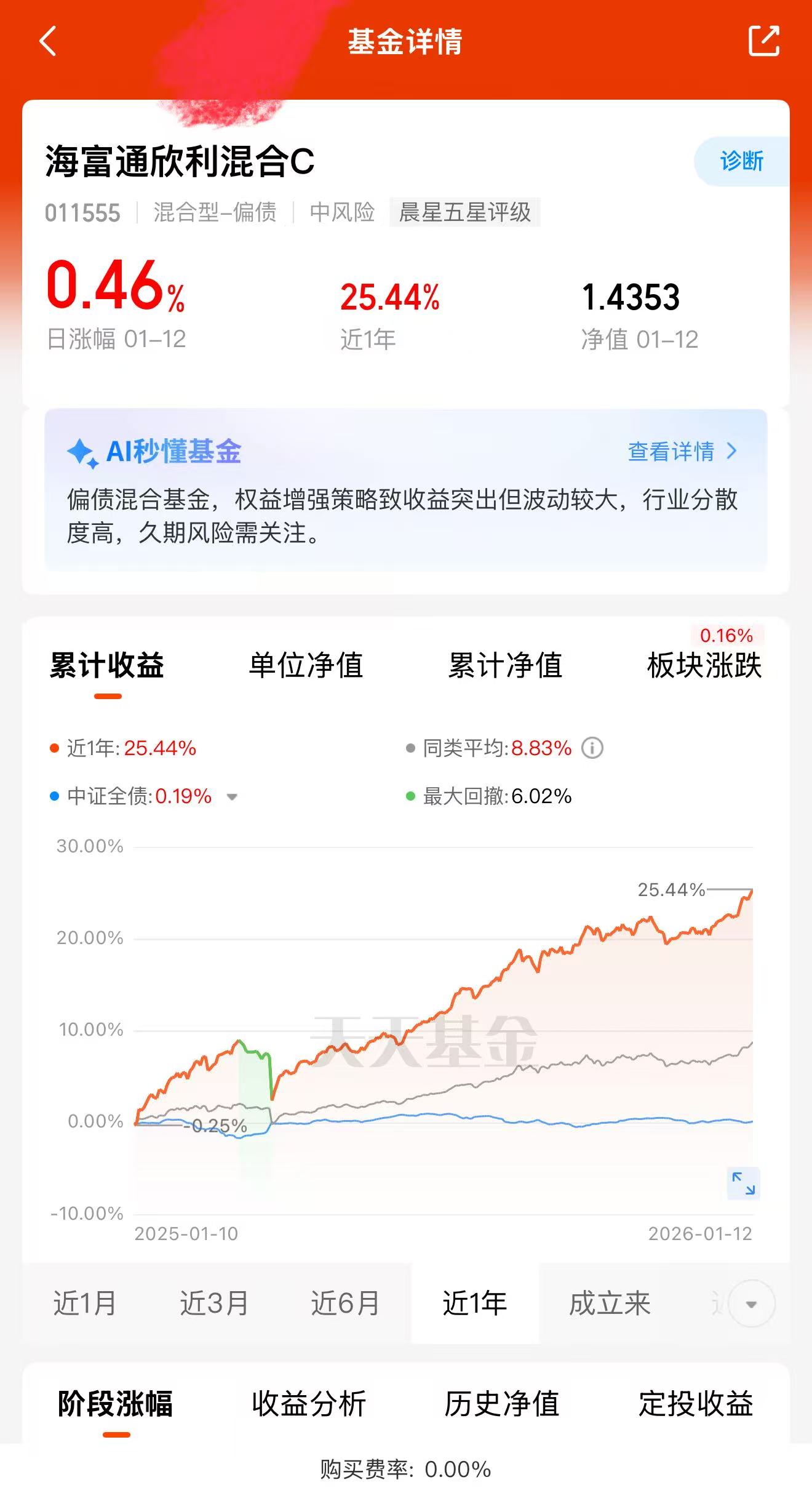 在此背景下,单一押注股或债可能面临阶段性波动风险。以$海富通欣利混合C(OTCFUND|011555)$为代表的偏债混合型基金,展现出“攻守兼备”的配置价值。