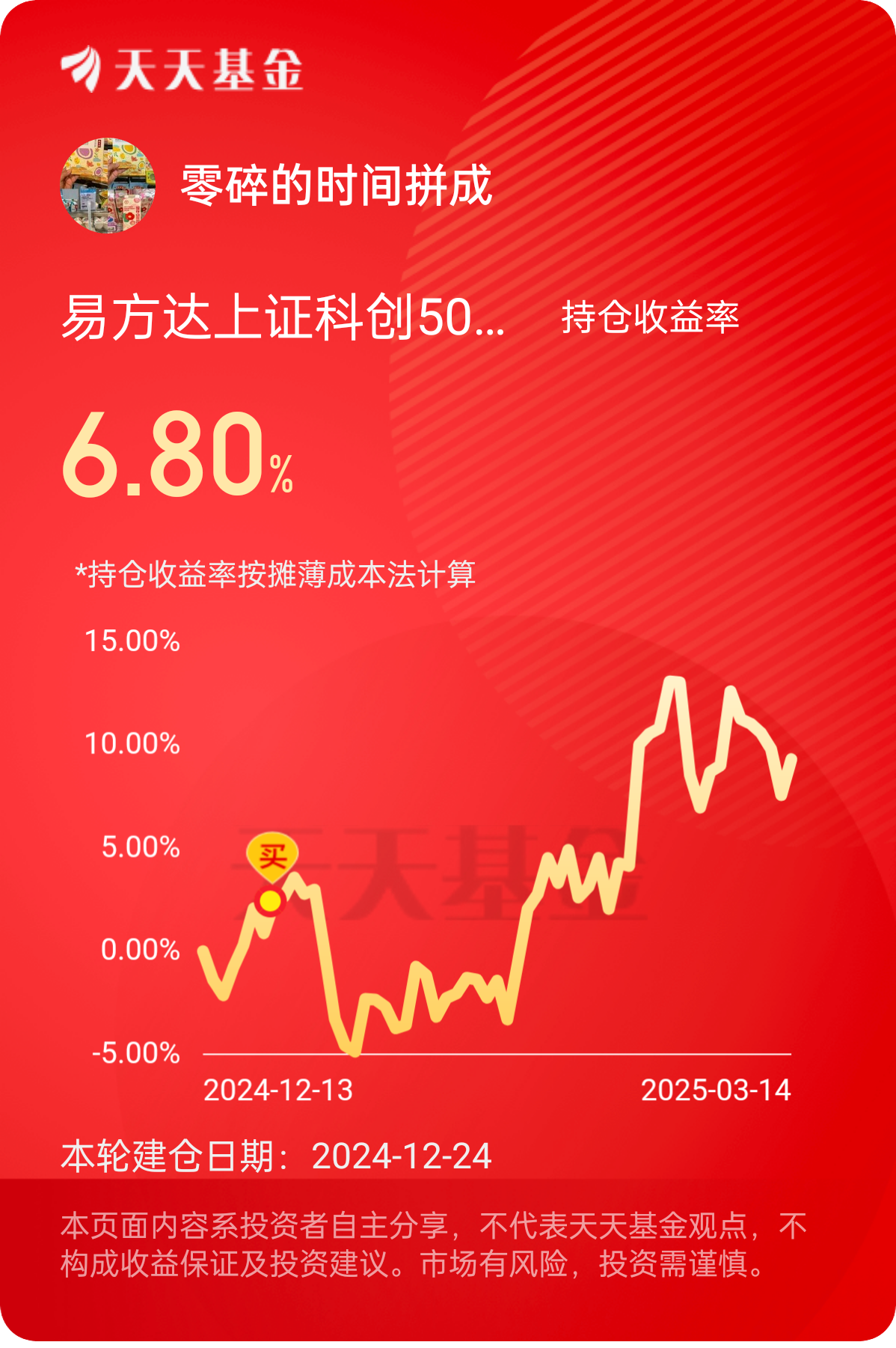 最近市场震荡有点厉害啊,不过这波回调我觉得反而是机会,手里还有闲钱,准备分批补点仓,期待后续反弹$易方达上证科创50联接C$ #晒收益#