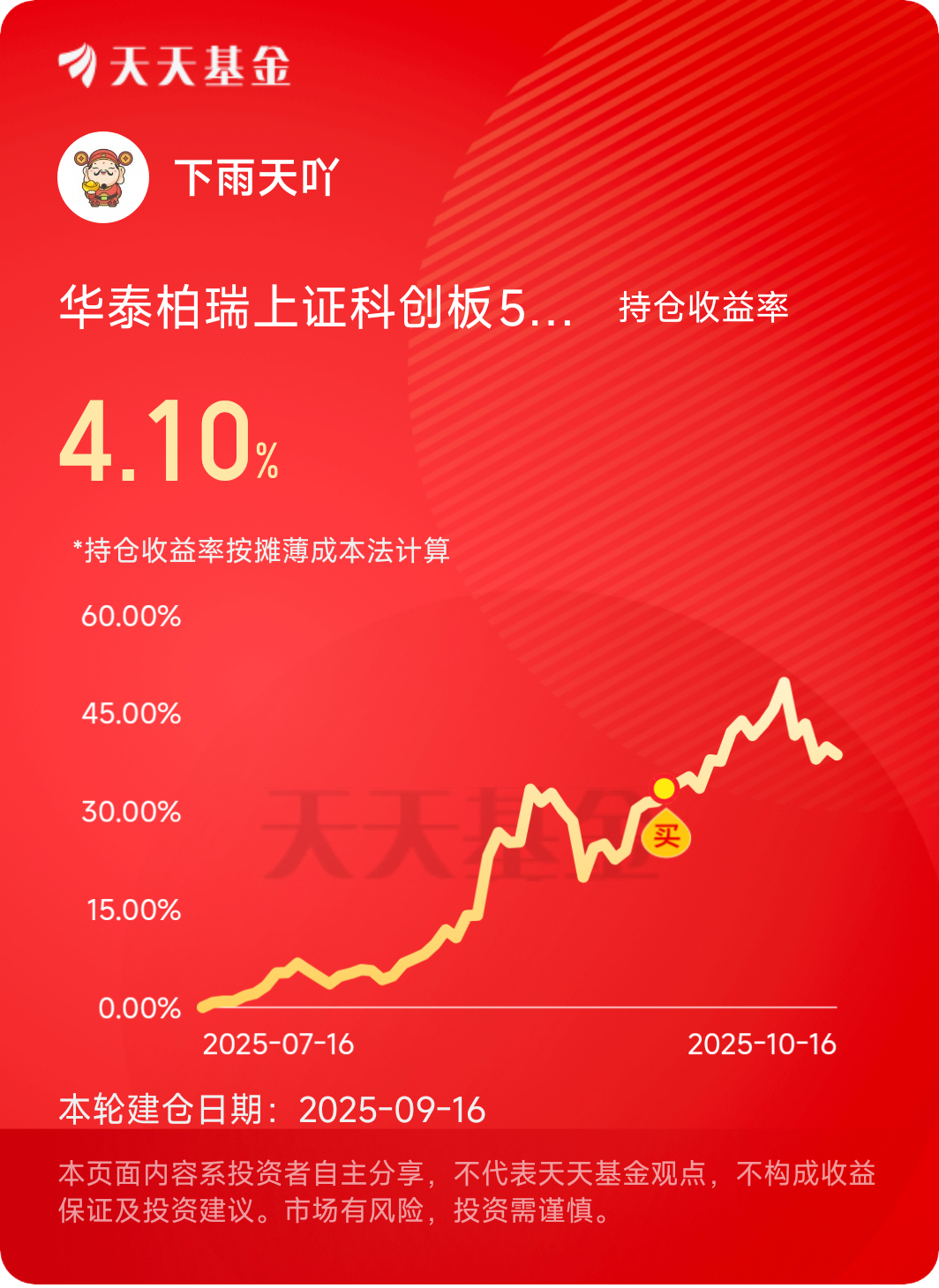 科技主线行情下,$华泰柏瑞上证科创板50成份ETF联接C$ 近3个月38.58%的涨幅提供了有力参考。个人会在市场调整时稳步加仓,布局未来产业趋势。