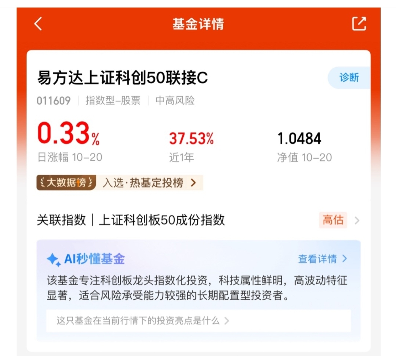 经过前期的调整,现在科创50的估值已经比较合理了,我觉得是个不错的布局机会。不过科技板块轮动太快,选个股风险比较大,所以我更倾向于通过基金来参与。$易方达上证科创50联接C$ 跟踪科创50指数,能够分散风险,比较适合现在的市场环境。科技创新是长期方向,趁着估值回调,我准备逐步建仓。