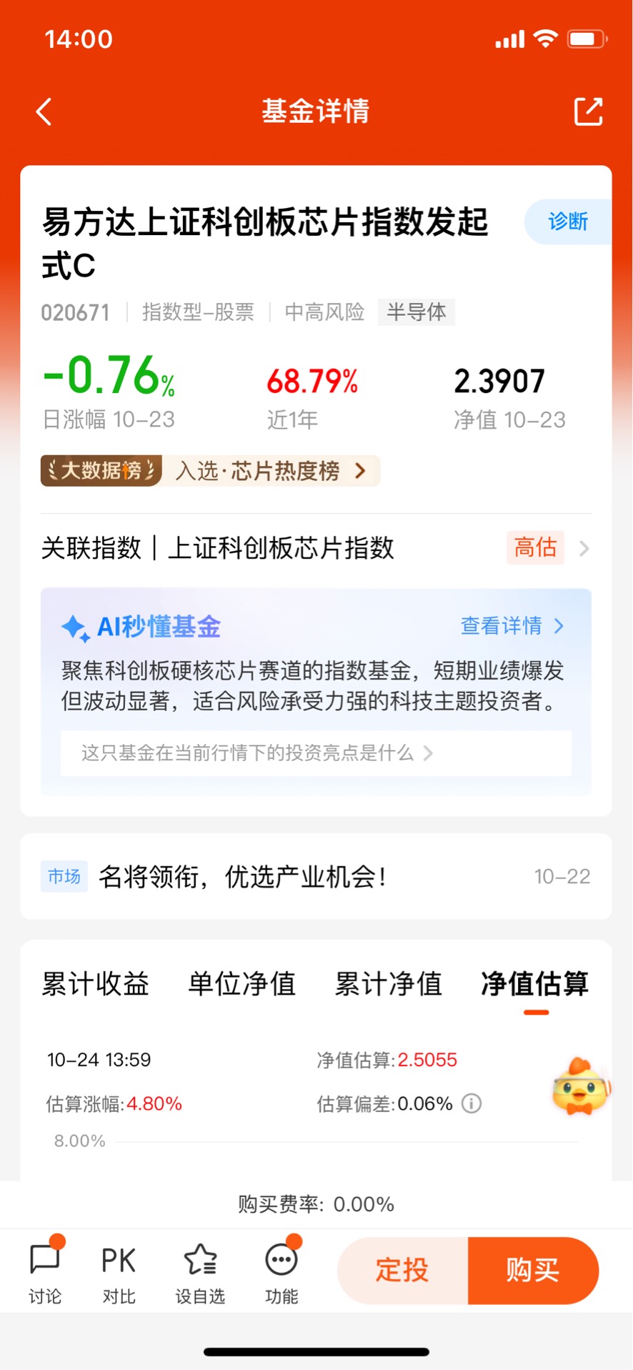 A股最近虽然波动挺大,但我反而觉得这是成长板块蓄势的阶段。如果美联储真的在年内再次降息,那资金面会宽松不少,成长股的估值修复就有戏了。再加上国内政策对科技创新的支持越来越强,像AI、半导体这些方向一旦热度回来,市场信心就可能被点燃。我自己持有的易方达上证科创50联接C(011609)已经赚了55.90%,体验非常好,所以这次我打算继续加仓。我更看好的是,未来一旦宏观环境转暖,这类代表硬科技力量的基金,可能会带头冲出新高。