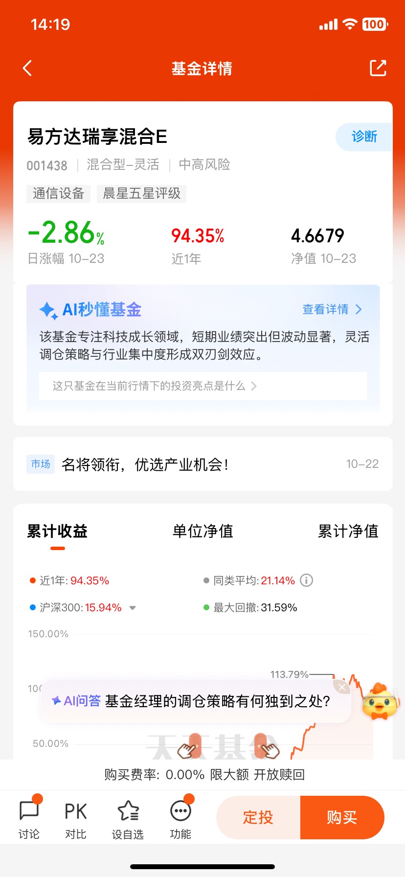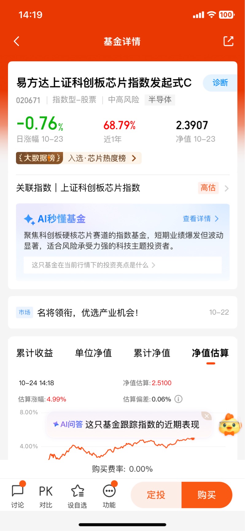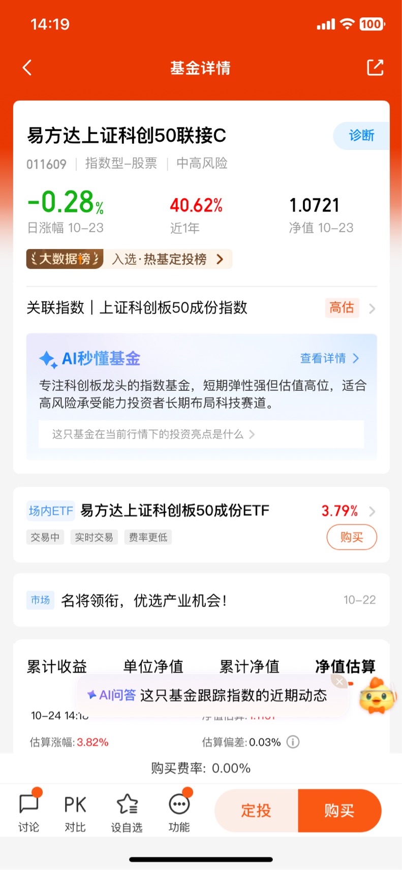 易方达上证科创50联接C主要投资于跟踪科创50指数的ETF,意味着相当于一键配置了科创板中市值最大、流动性最好的50家“硬科技”公司。作为指数基金,它的优势在于紧密跟踪指数、管理费率较低。这意味着如果看好科创板的长期发展,可以通过它来分享板块整体的增长红利,同时投资成本也相对低廉。同时可以考虑采用定投的方式分批买入,从而平均成本,分散风险。@易方达基金