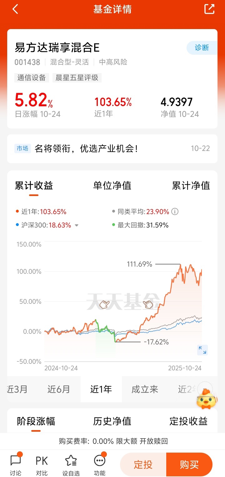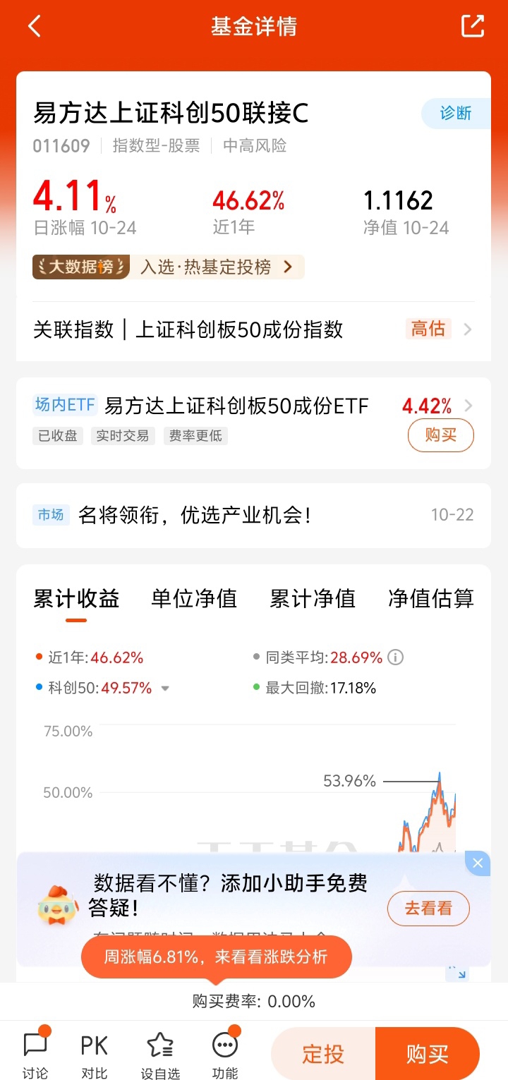 当前科创50指数PE(TTM)为45倍,处于历史中位数,可投入50%资金至易方达上证科创50联接C,锁定三季报业绩驱动的修复行情。若板块回调10%-15%,每月定投剩余资金的30%,平滑成本,避免追高风险。@易方达基金