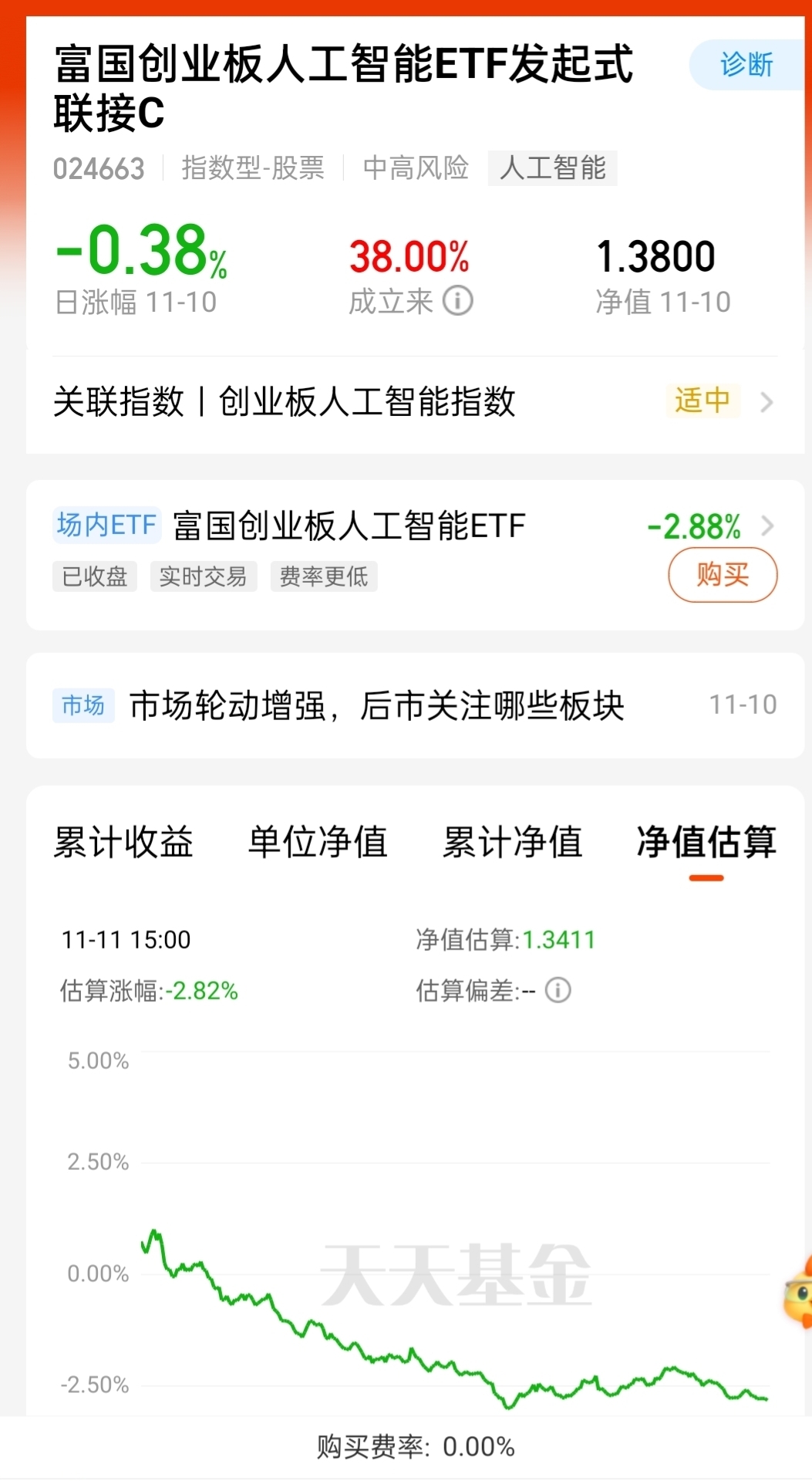 持仓易方达科创板50C,也配了点富国创业板人工智能ETF联接C,看它近6个月涨3