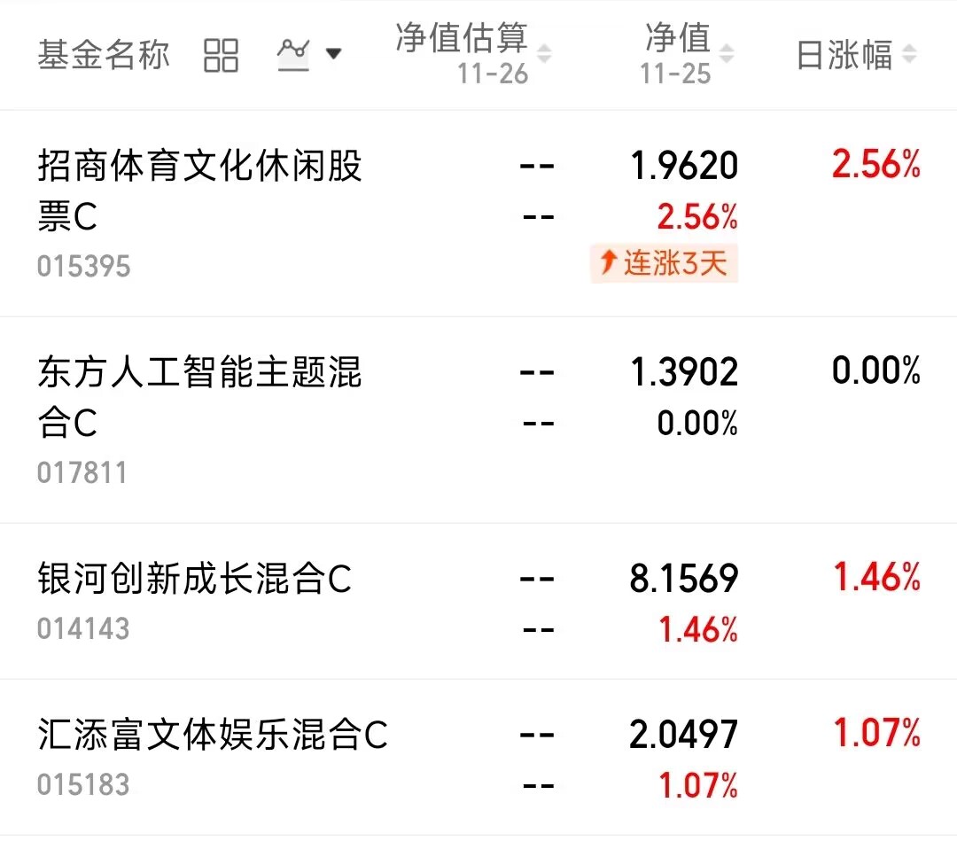 前面连续两天普涨反弹,可昨天午后能明显感觉到,资金追涨的意愿不强。这波反弹,更多是因为抛压减轻才起来的,市场大概率不会一直涨,可能会偏震荡,操作上可以选择持续强的板块。$招商体育文化休闲股票C(OTCFUND|015395)$昨日上涨2.56%,持续3天反弹!