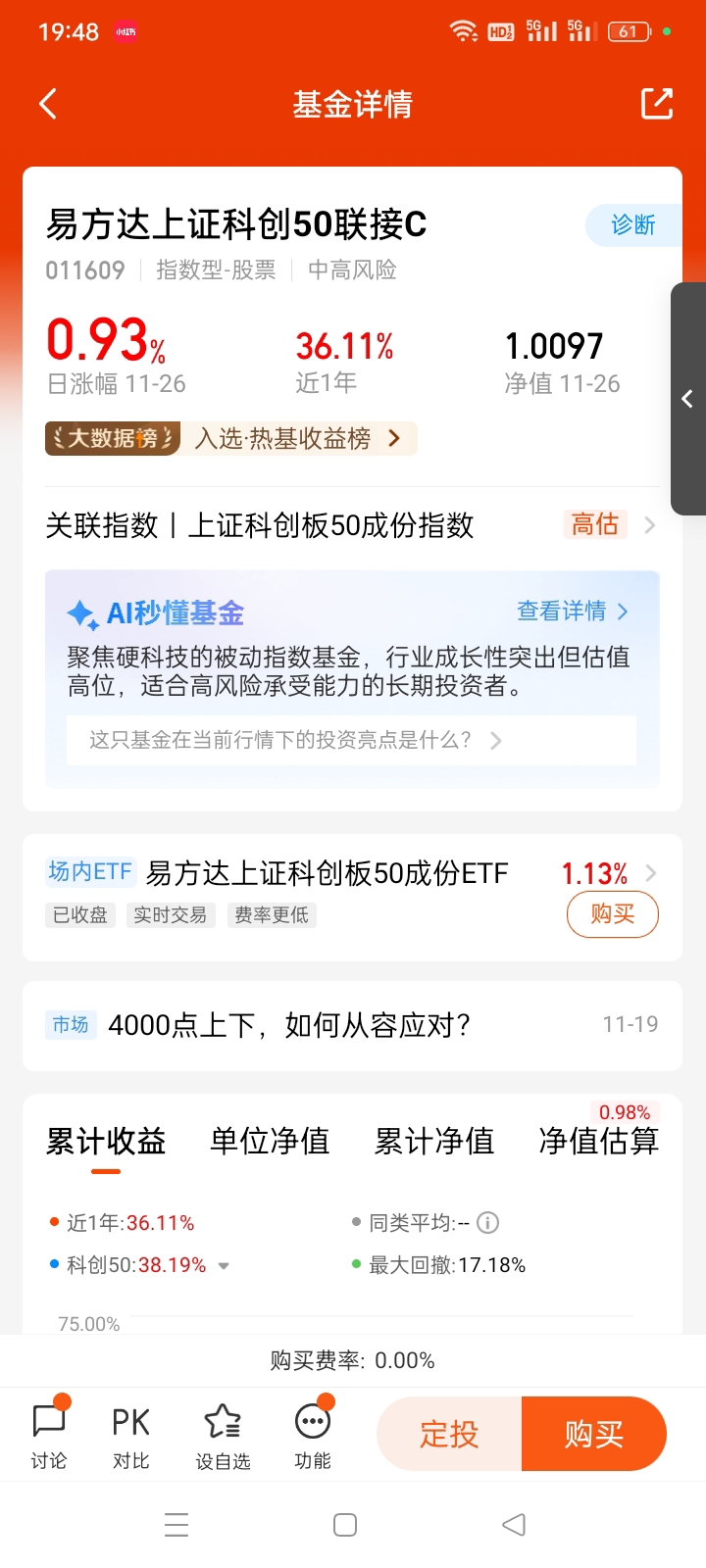 011609是ETF联接基金,紧密跟踪科创50指数,通过投资易方达上证科创50ETF间接持有科创板50家核心龙头企业。