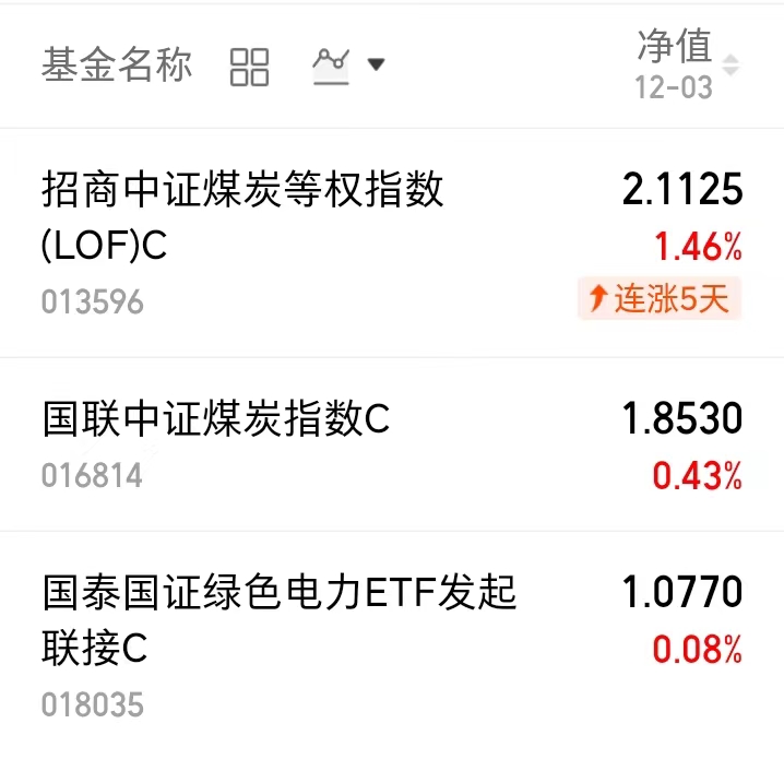 煤炭板块需求旺季来临,冷冬预期强化供需缺口,近期持续上涨。$招商中证煤炭等权指数(LOF)C(OTCFUND|013596)$昨天上涨1.46%,涨幅继续拉升。
