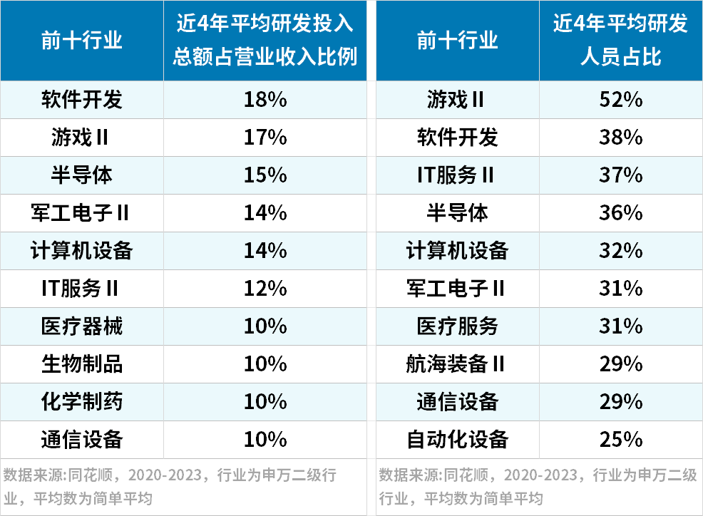 虽然站在不同时间点测算观察,行业排序略有差异,但是从2020-2023这四年的整体情况来看,研发投入总额占营业收入比例和研发人员占比均较高的行业有软件开发、游戏、半导体、军工、计算机设备、IT服务、通信设备以及生物医药(医疗器械、化学制药、医疗服务)等新兴行业。