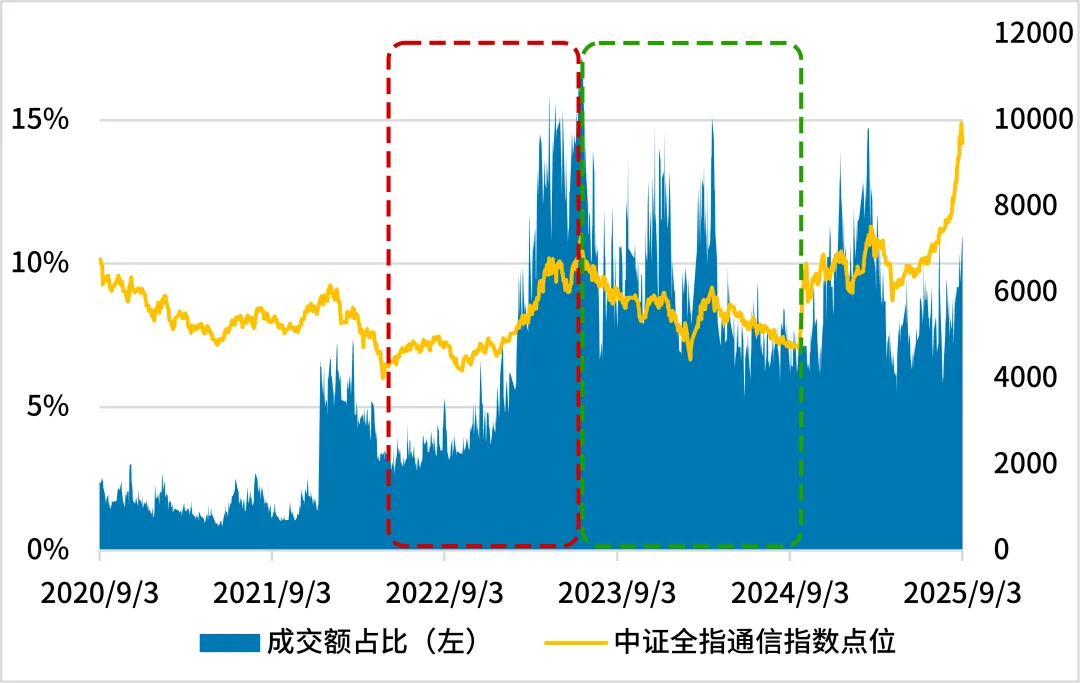 同样的,今年表现较好的通信行业在成交额占比上也比较高(见图3),成交额占比与指数表现大致呈现出正相关的关系,当占比到达相对高位区间后(见图4绿框),指数也开始承受回调的压力。