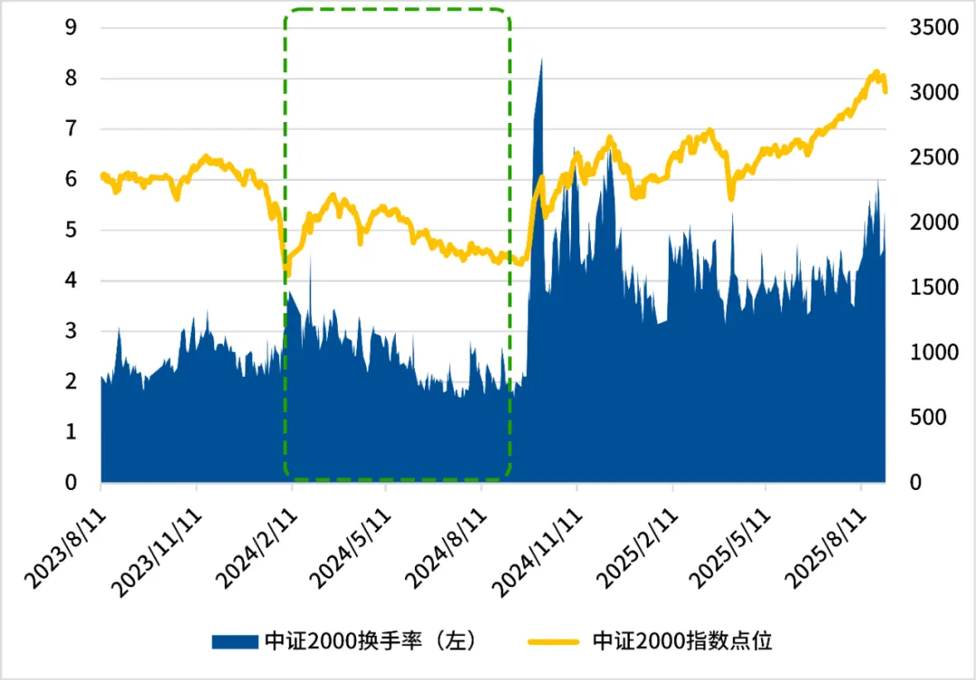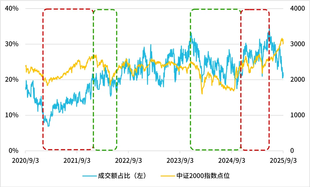 我们将中证2000的成交额占比与指数历史表现进行对比,可以发现:当成交额占比从低点上行时,往往释放了一种积极的信号,指数也有较好的表现(见图2红框),但随着占比上升触及区间高点,市场往往会面临大幅回调的压力(见图2绿框)。