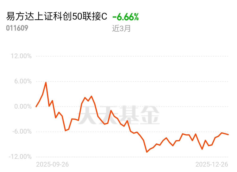 其实早就听说科创50指数不一般,里面都是半导体、AI这些硬科技龙头,虽然波动大,但涨起来也猛,单年能暴涨七十多 percent。去年上半年,身边不少朋友都说买了这只易方达的科创50联接C赚了钱,我看着基金净值从年初的低位慢慢往上爬,到了年中已经涨了不少,心里开始按捺不住。尤其是看到二季度过后它开始发力,身边有人晒出两位数收益时,我彻底没忍住,在净值高点的时候跟风重仓买入了。