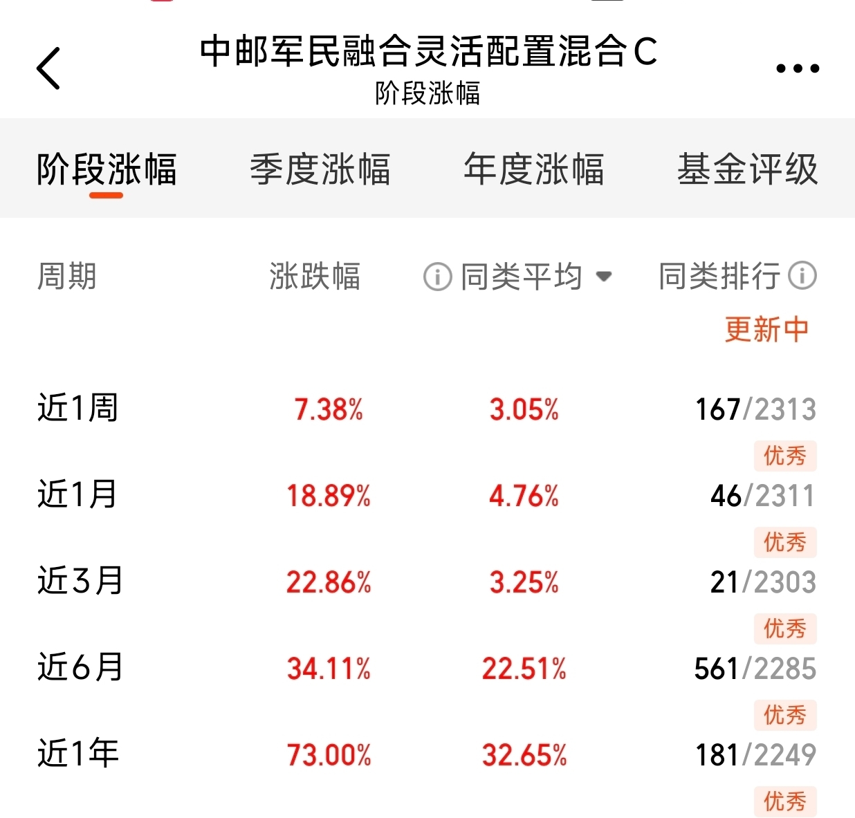 还是军工给力,今天又是吃肉的一天,$中邮军民融合灵活配置混合C$连涨模式,净值涨