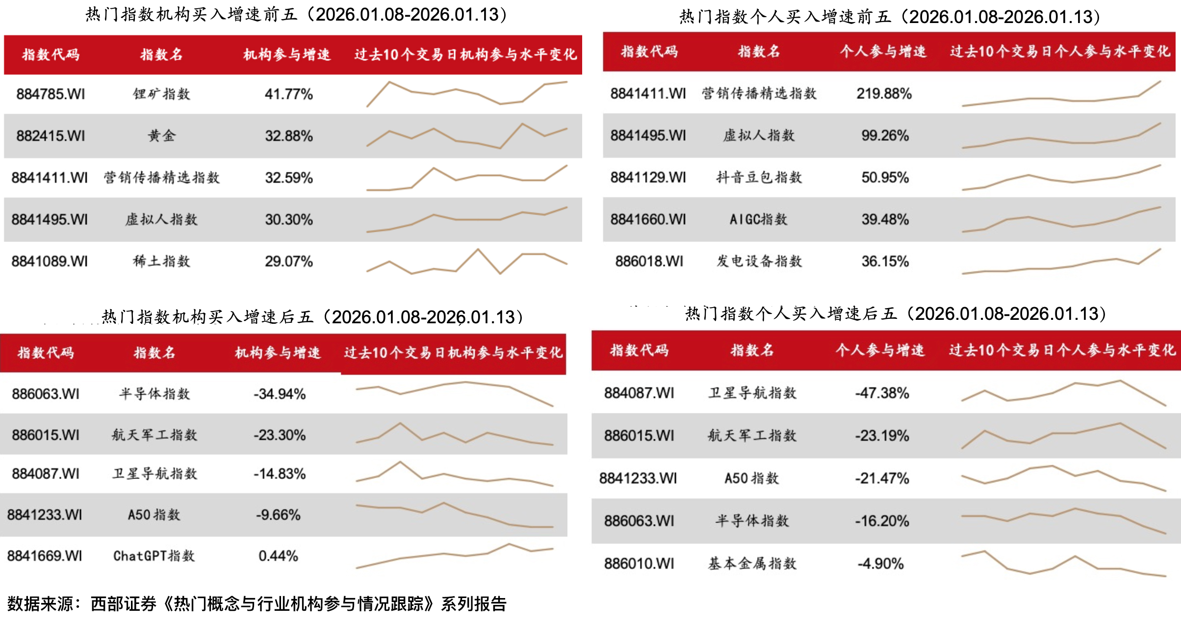 西部证券最新研报显示,去年8月底,A股成交额突破3万亿时,机构投资者买单/撤单数量明显上升,而个人投资者买单撤单情况相对平稳。本轮春躁行情中(2026年1月9日-1月13日),机构买单/撤单数量先是小幅回落,随后又出现回升。