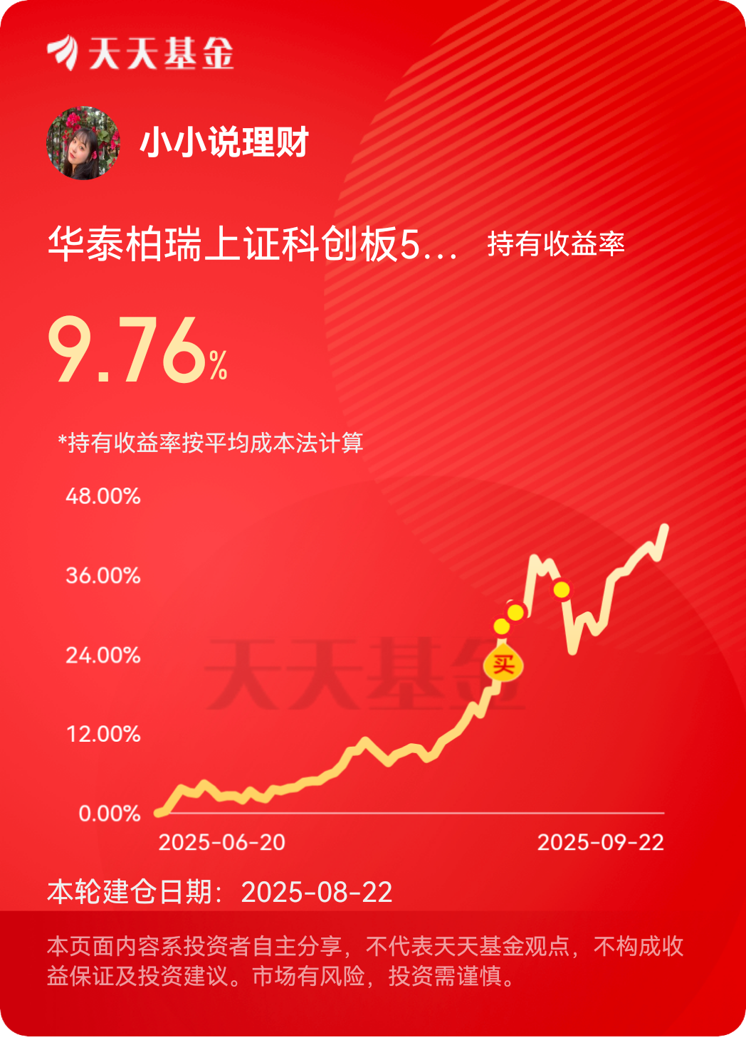 今儿个盘面上,A股三大指数都是微涨,但是科创板却是独立大涨,尤其是科创50,大涨逾3.3%,小小持有的$华泰柏瑞上证科创板50成份ETF联接C$ 今儿个也是完全跟上了指数表现,大涨3.3%,比科创100指数1.4%的涨幅多出不少,小小持有收益已经来到了10%,之前小小做加法的时候,还有很多小伙伴觉得是追高,怕怕,但是从结果论来说,牛市里有时候右侧加法还是很必要的。