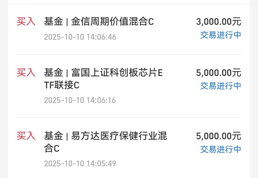 我今天加仓了科创50指数、消费电子、金信周期价值、科创芯片、易方达医疗保健,其它基金继续持有待涨。