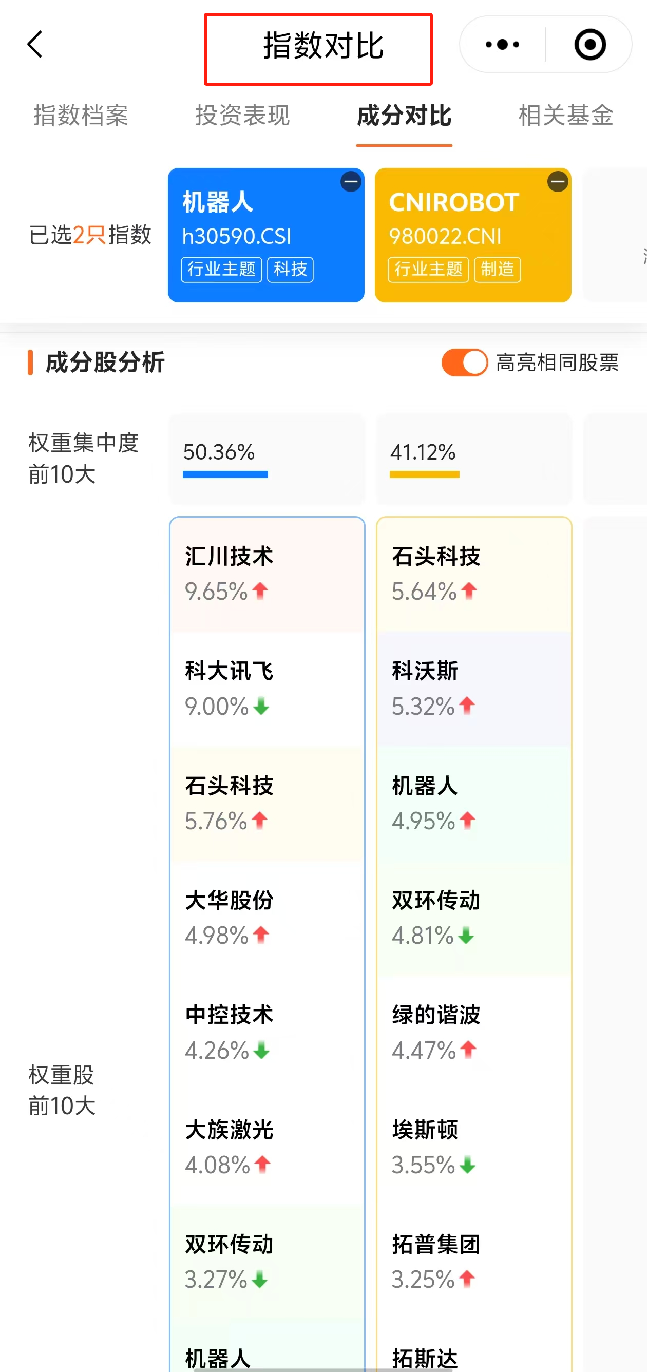 更贴心的是它的“指数对比”功能,可以把几个指数放在一起PK,业绩、估值、行业构成、权重占比一目了然!这样一来,小白买ETF再也不是开盲盒,而像是在超市全货架选品,优中选中超省心。