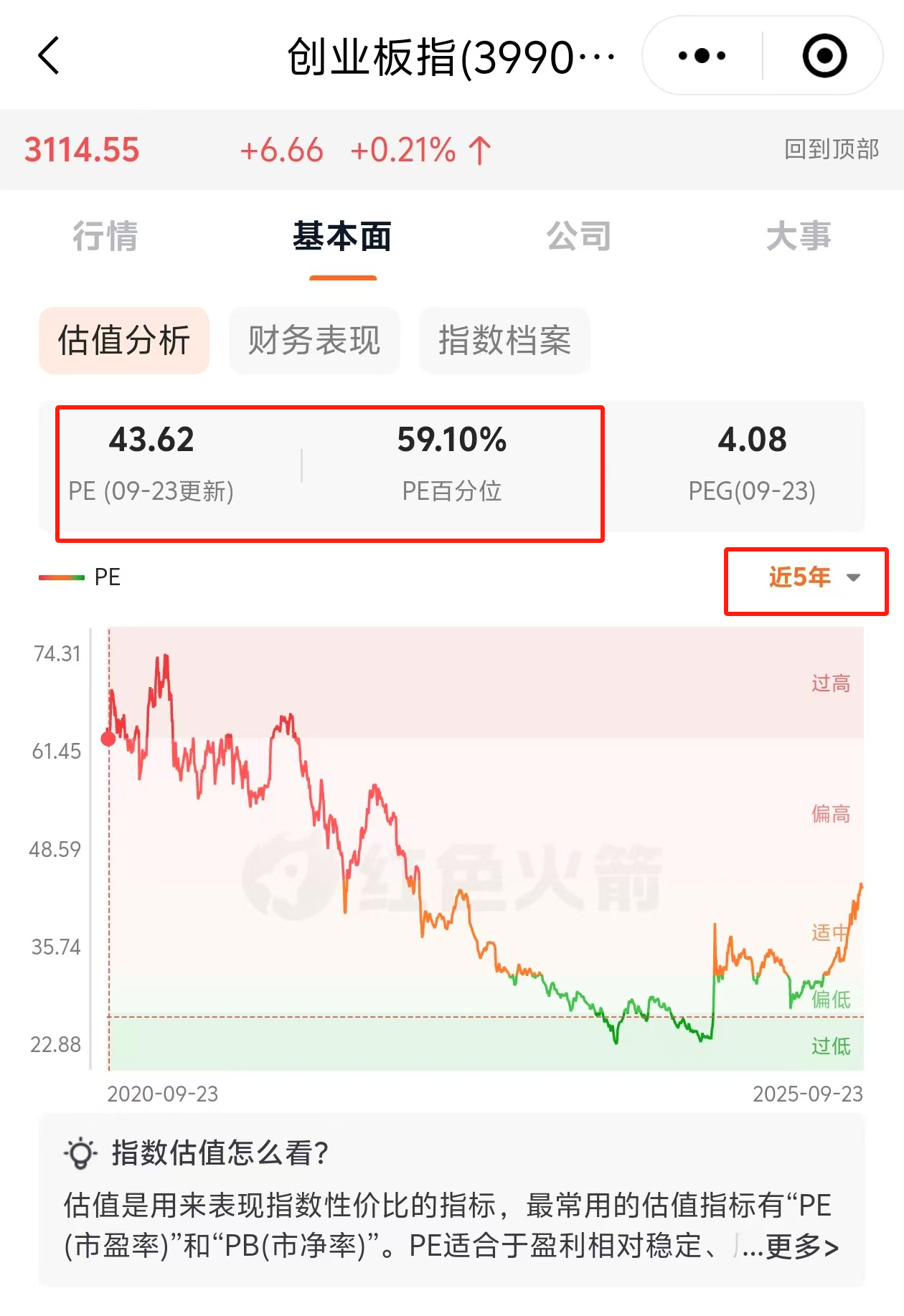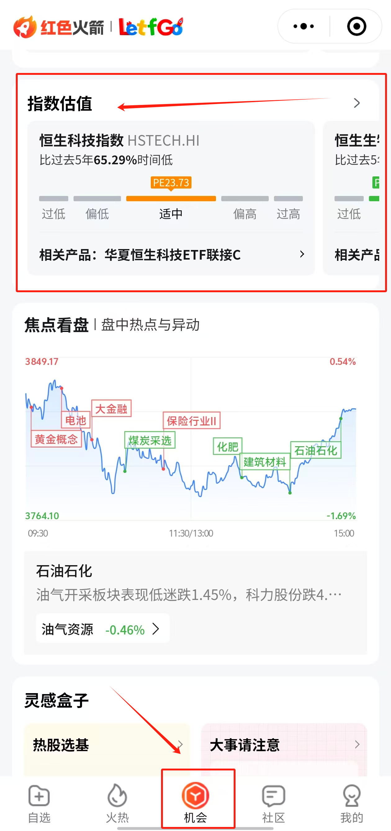再回到“红色火箭”的“机会”主界面,找到“指数估值”点进去,就能看到当前全市场指数的估值排名。