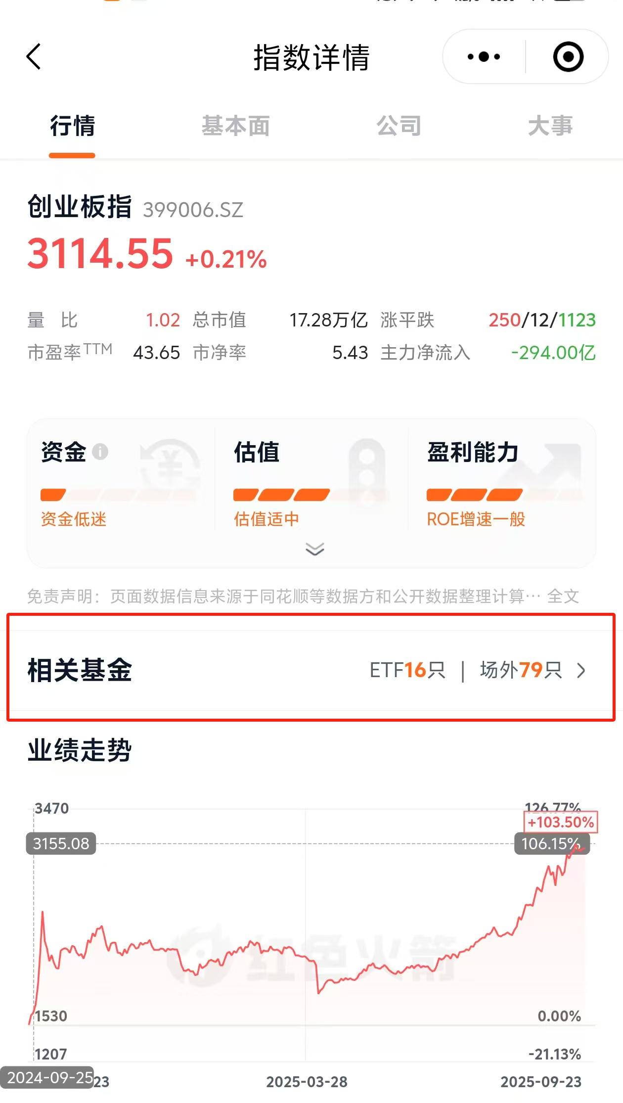 点击进入“创业板指”的详情页,可以清楚看到指数的估值情况、行业构成、权重股等等非常详细的信息,还能够直接找到指数的“相关基金”,立马就能选到流动性好、费率最优的ETF,不用再到处查资料。$华夏创业板ETF联接C(OTCFUND|006249)$